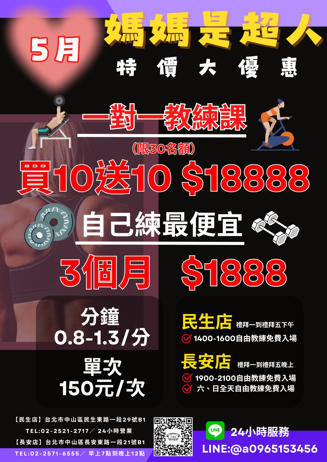 母親節優惠!您雖然已長滿白髮,但在我的心目中,您還是那麼青春有活力!媽媽我愛您,祝您母親節快樂。 母親節優惠!買10堂送10堂只要18888元限30個名額 上述方案可轉讓不能退,若無法配合請勿購買謝謝 要不要幫你保留機會不多敬請把握 台北市中心唯一「免場租費不限時間一家報名2家都可使用」 自由教學場館 24小時服務專 LINE:@a0965153456 ——————— 民生店:台北市中山區民生東路一段29號B1 長安店:台北市中山區長安東路一段21號B1 ———————